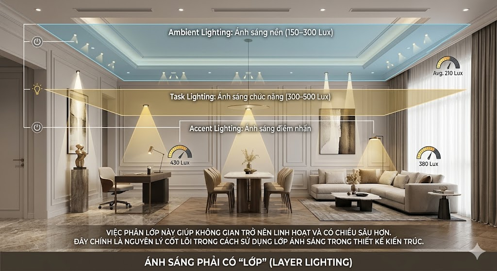 Một không gian cao cấp không sử dụng một nguồn sáng duy nhất. Thay vào đó là sự kết hợp nhiều lớp ánh sáng: