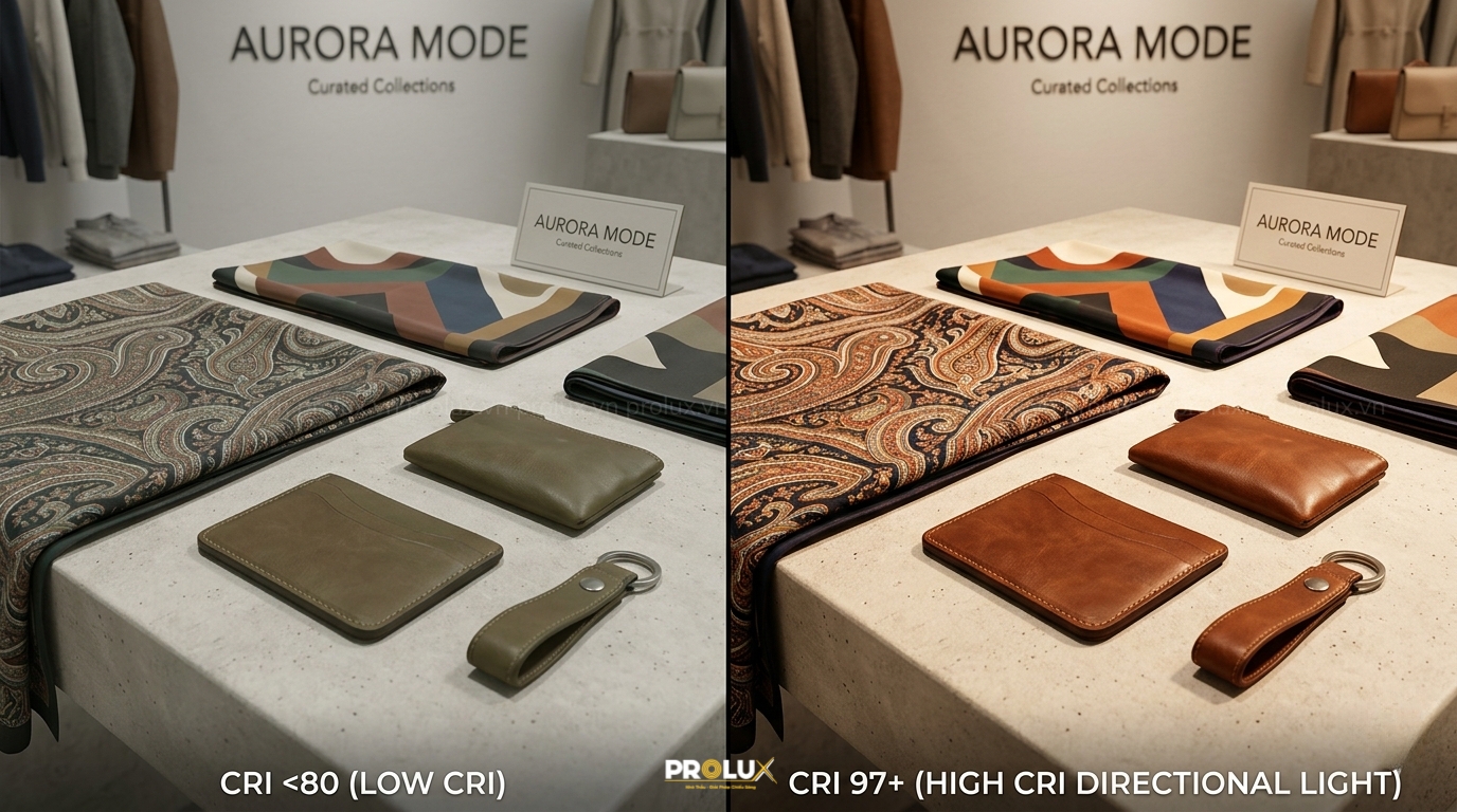 Đối với không gian bán lẻ cao cấp, chỉ số CRI phải đạt từ 90 trở lên. Đặc biệt, chỉ số R9 (màu đỏ bão hòa) cần được chú trọng để tái hiện trung thực màu sắc vải vóc và sắc tố da người trong phòng thử đồ.